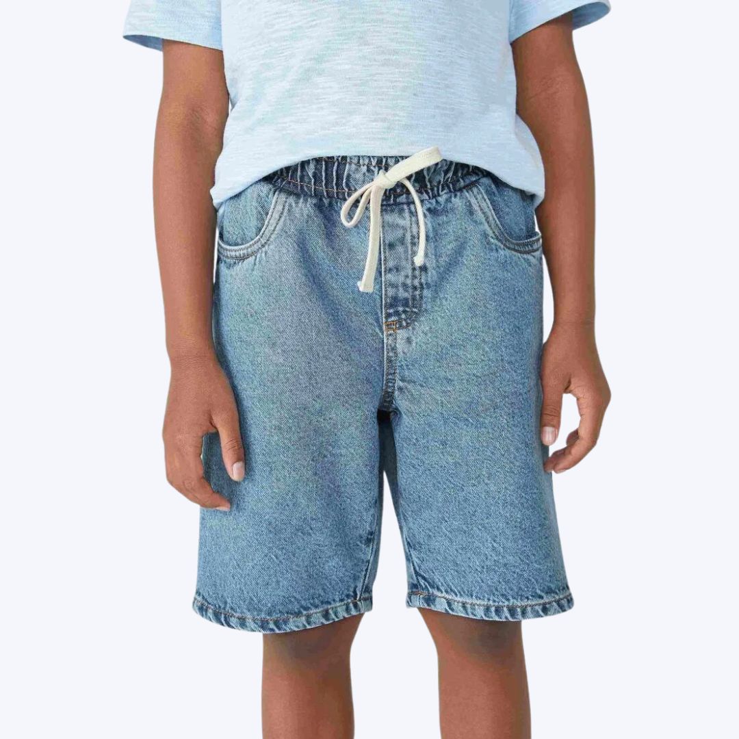 Bermuda jeans com modelagem chino. Possui comprimento acima dos joelhos, cós com elástico e cadarço em algodão enfeite, e bolsos funcionais. Produzida em jeans 100% algodão.
