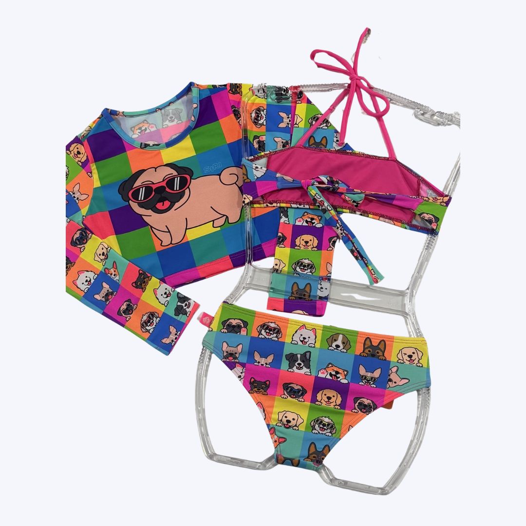 Biquíni com 3 Peças Colorido Dog Infantil Feminino Siri Moda Praia