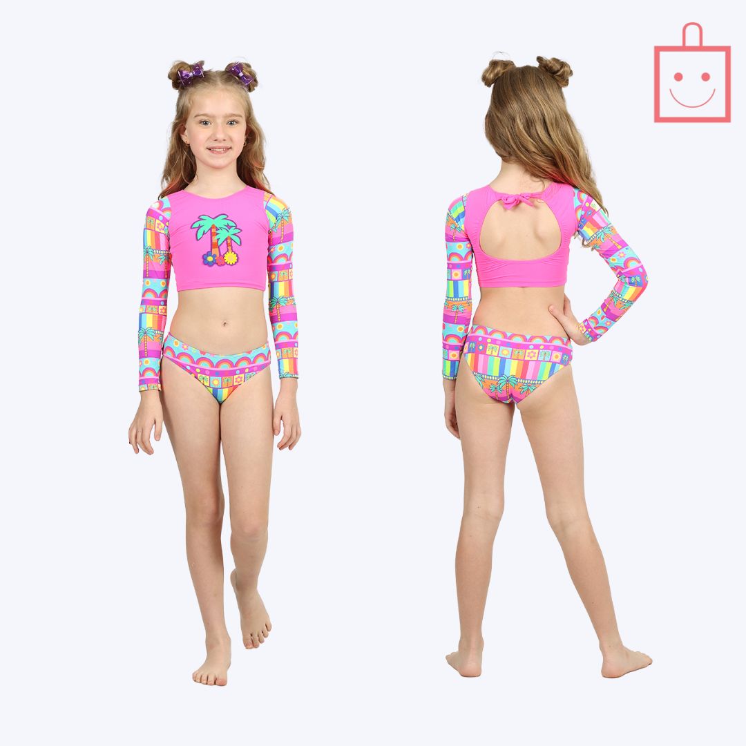 O biquíni é composto por duas peças: um top cropped manga longa e uma calcinha tanga. O top manga longa traz uma estampa encantadora de coqueiros na parte frontal, que remete ao clima tropical e à vibe de férias. A manga longa não só adiciona um toque fashion, mas também oferece mais cobertura e proteção para os braços, ajudando a manter a pele da sua filha protegida contra os raios solares durante todo o dia. Já a calcinha tanga, com uma estampa colorida e vibrante, complementa o conjunto com um toque alegre e cheio de personalidade.