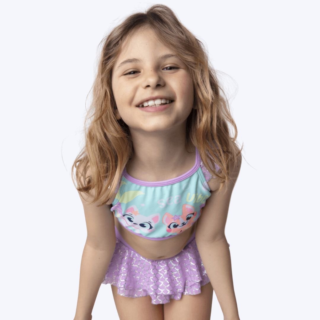 - Proteção UV: O biquíni é desenvolvido com tecido que possui proteção solar UV, ajudando a proteger a pele delicada das crianças, sem substituir o uso do filtro solar.