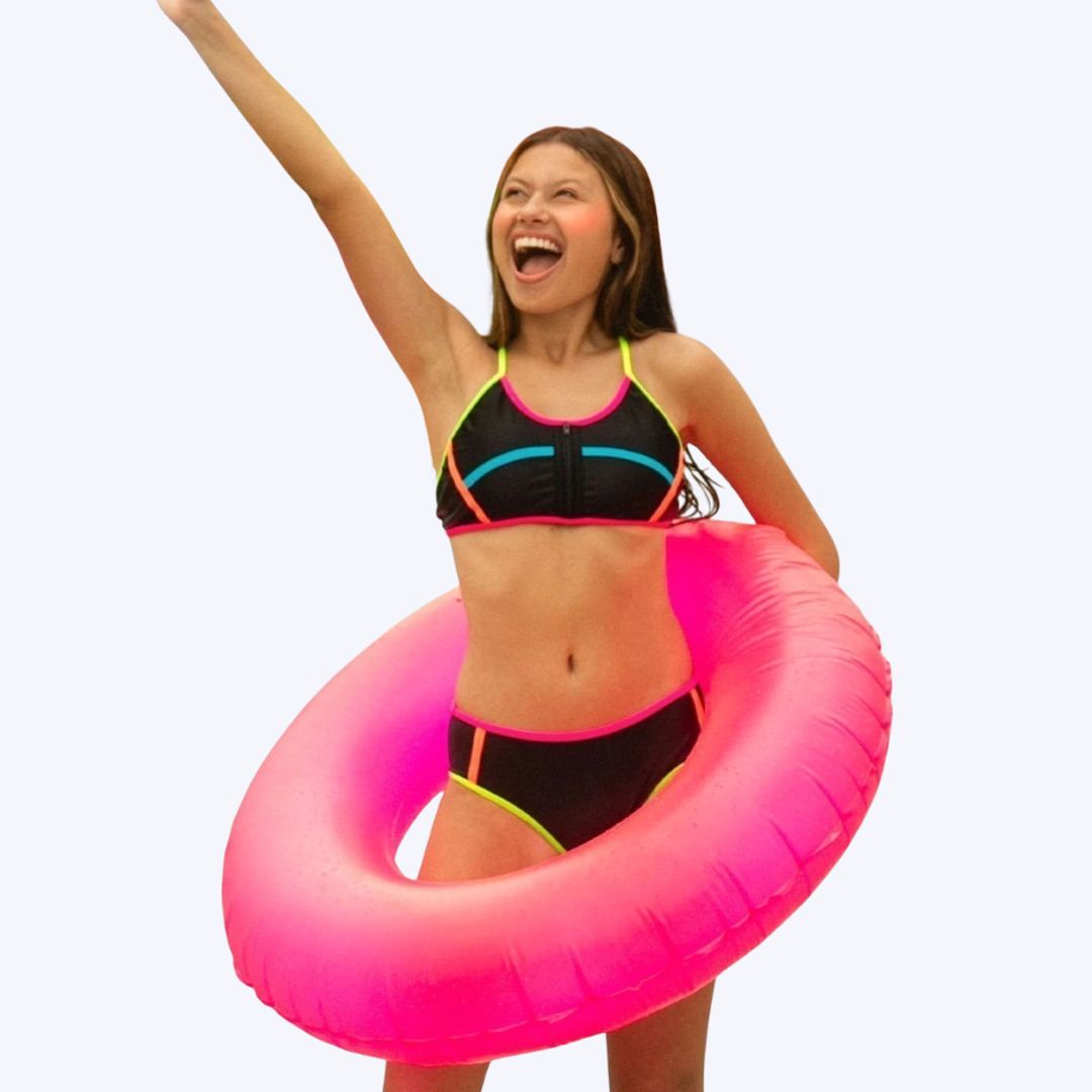 Biquíni preto com detalhes coloridos, modelo faixinha juvenil. Possui amarração dupla na parte de trás e detalhe de zíper no busto na frente.