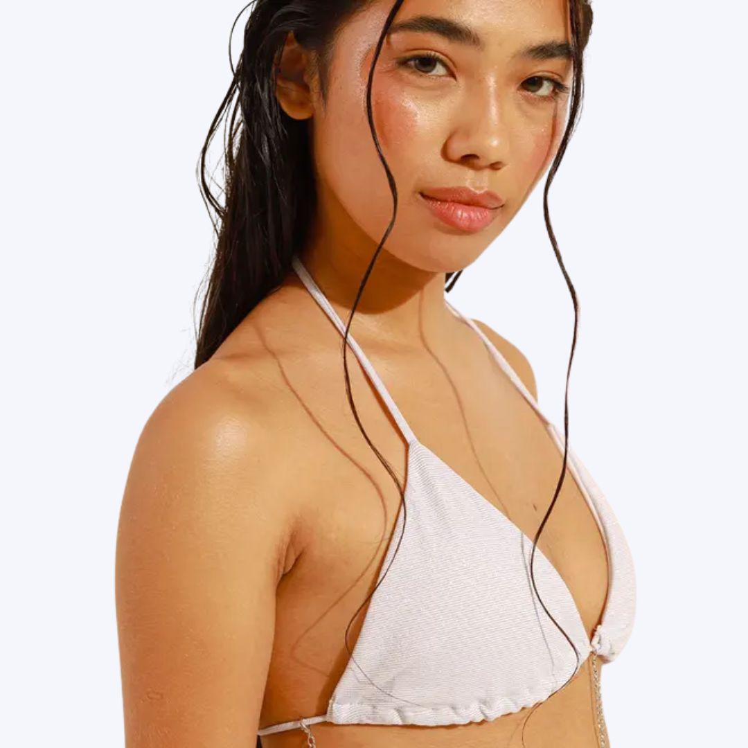 Para prolongar a vida útil do seu Biquíni Shine Branco, lave-o à mão, do avesso, o mais rápido possível após o uso, para remover resíduos de cloro ou sal.