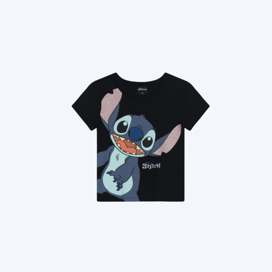 - Estampa Stitch com aplicação em glitter para um toque exclusivo
