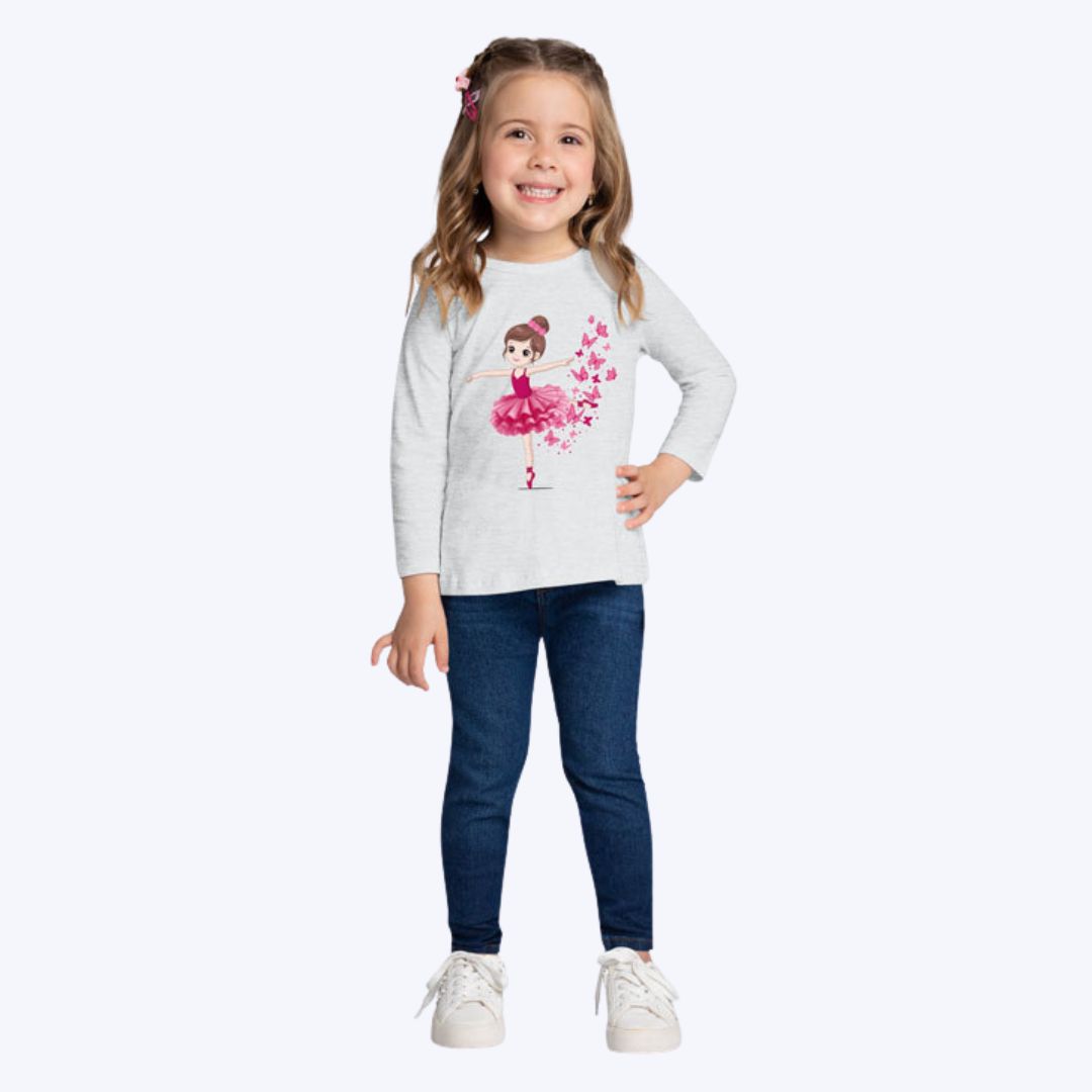 O destaque da peça fica por conta da estampa frontal de bailarina, que adiciona um toque de graça e delicadeza, trazendo um ar de elegância ao look. Com mangas longas, a blusa é perfeita para os dias mais fresquinhos, mantendo a pequena aquecida e confortável sem perder a leveza.