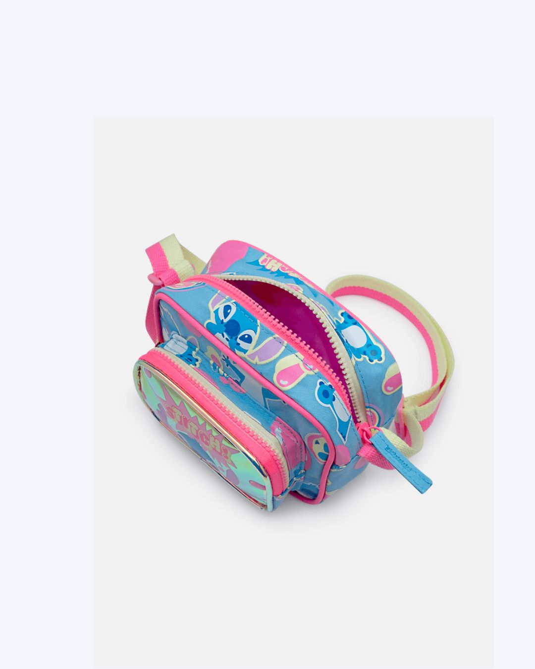 Bolsinha com bolso frontal em TPU holográfico com estampa do Stitch. Possui alça regulável.