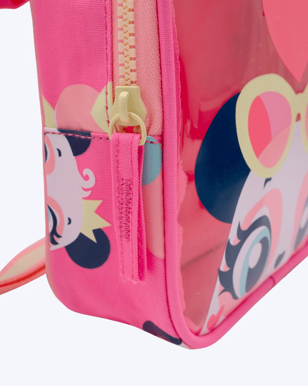 Bolsinha com frontal em PVC transparente com estampa de panda. Possui alça regulável.