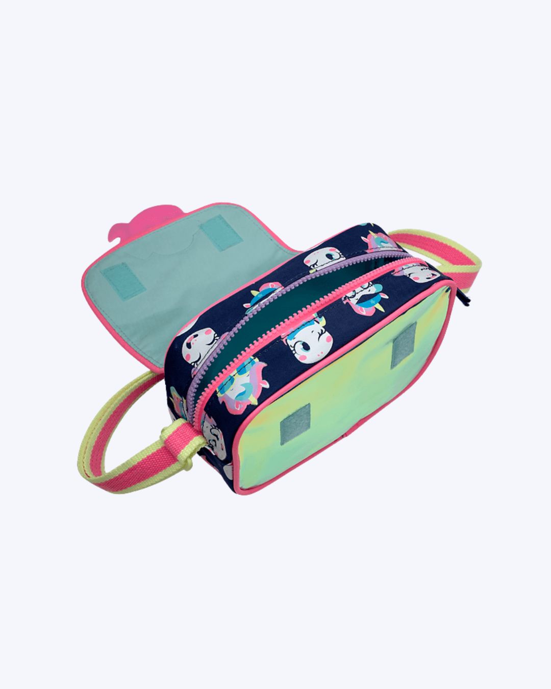 Bolsinha com bolso flap em nylon com estampa de unicórnio, parte frontal em TPU holográfico e emborrachado de unicórnio. Possui alça regulável.