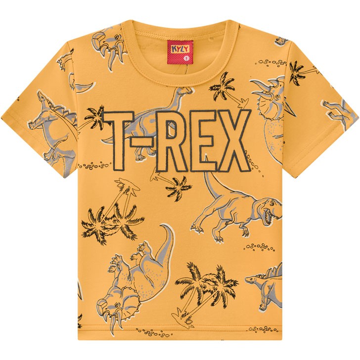 Roupa infantil masculina da marca Kyly, confeccionado com tecido de qualidade, trazendo um conforto maior a criança. Camiseta de manga curta, com estampa de dinossauro escrito T-REX com estampa alto relevo.