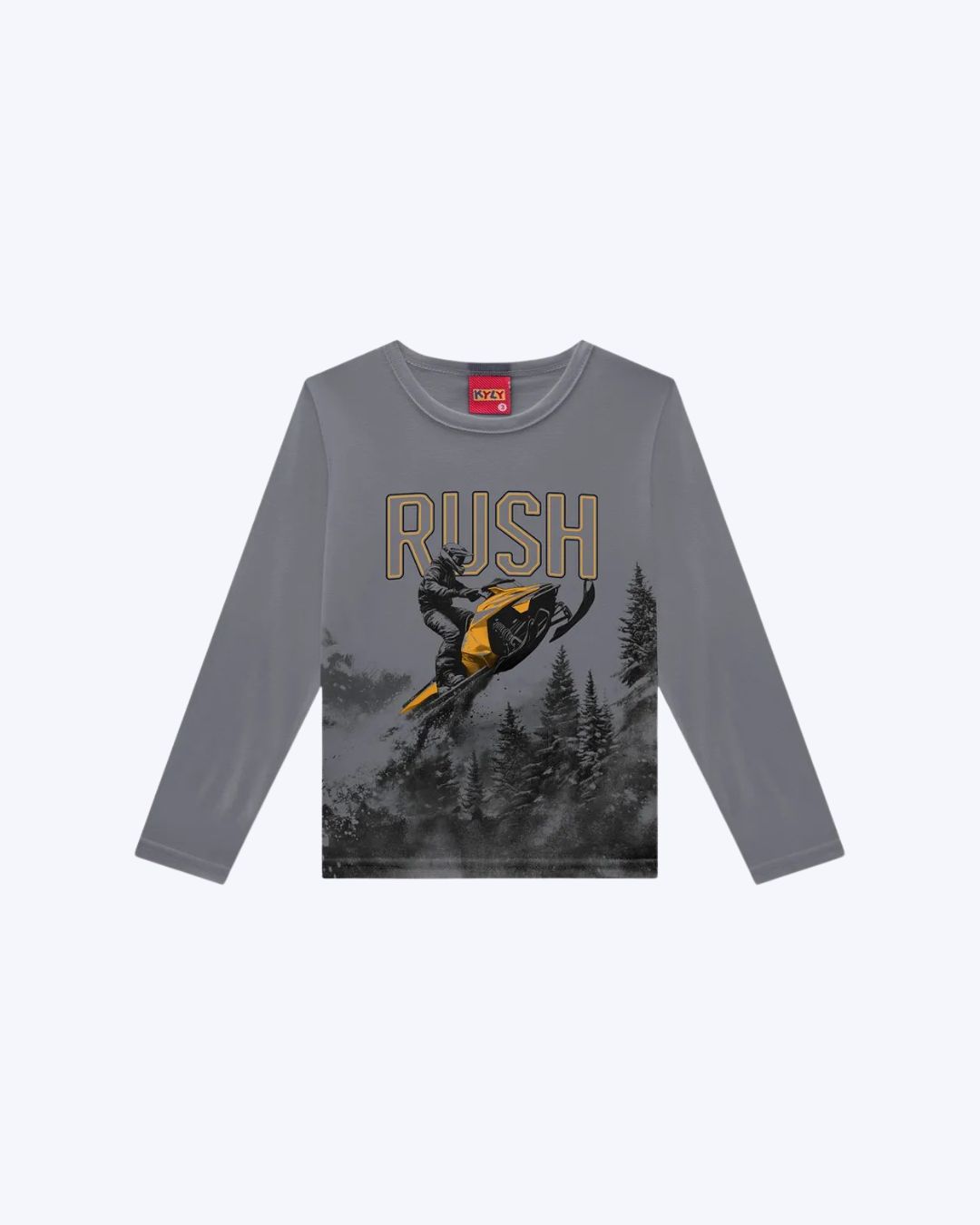 O destaque fica por conta da estampa localizada que traz a cena dinâmica de um esporte na neve, com árvores ao fundo criando um cenário aventureiro e cheio de personalidade. O lettering “Rush” complementa o visual, reforçando a proposta esportiva e moderna da peça, que transmite energia e espírito de aventura. Versátil e estilosa, esta camiseta infantil menino é ideal para compor looks casuais e confortáveis, refletindo a qualidade e o cuidado nos detalhes característicos da marca Kyly.