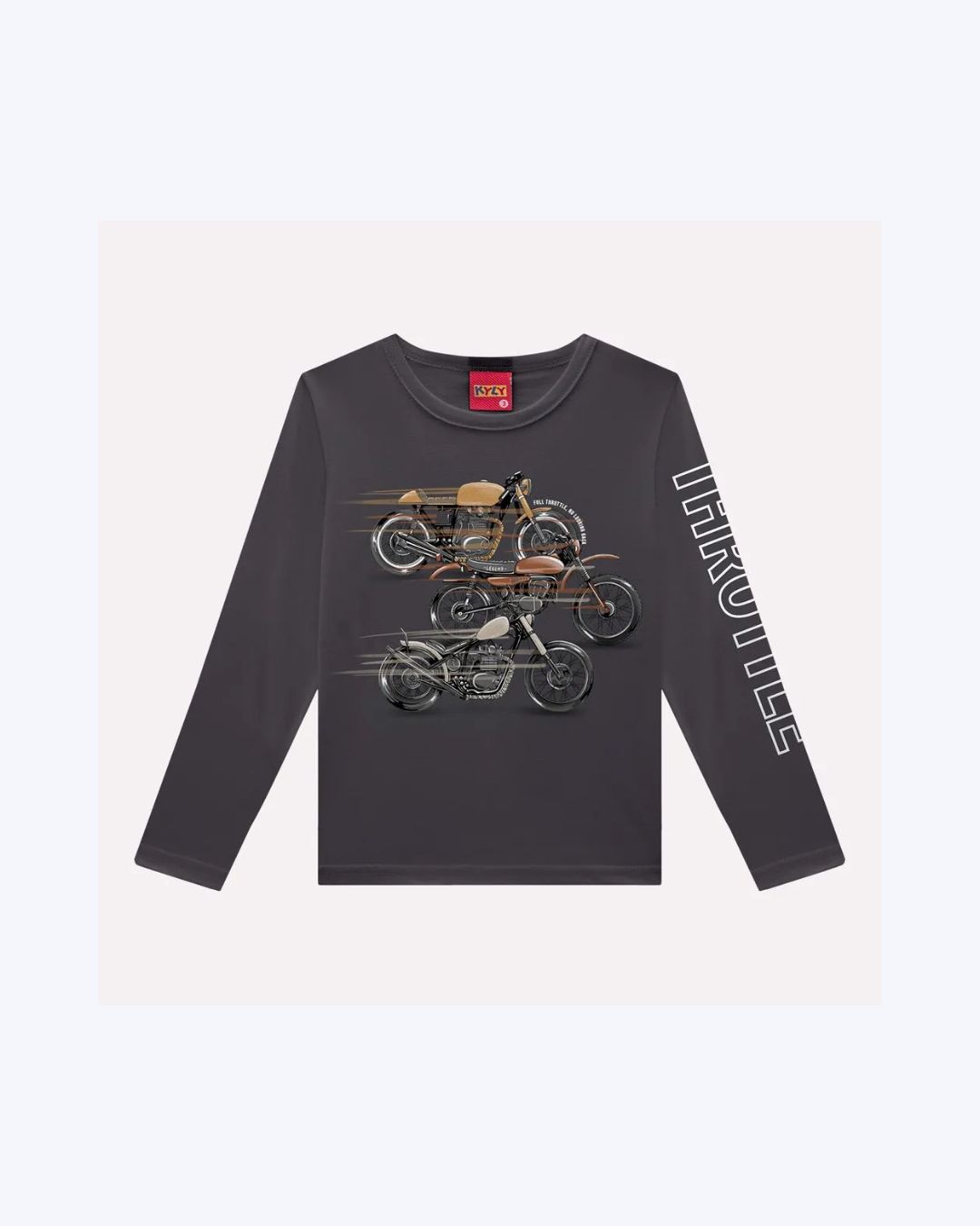O destaque da peça está na estampa localizada de motos, que traz ilustrações detalhadas e cheias de atitude, criando uma composição dinâmica e moderna. O design também conta com detalhe de lettering aplicado na manga, complementando o visual com um toque contemporâneo e esportivo. A gola com acabamento em ribana reforça a estrutura da peça e proporciona ajuste confortável. Versátil e cheia de personalidade, esta camiseta infantil da Kyly é ideal para compor looks casuais e despojados, combinando facilmente com bermudas, calças ou conjuntos confortáveis para diferentes ocasiões do dia a dia.