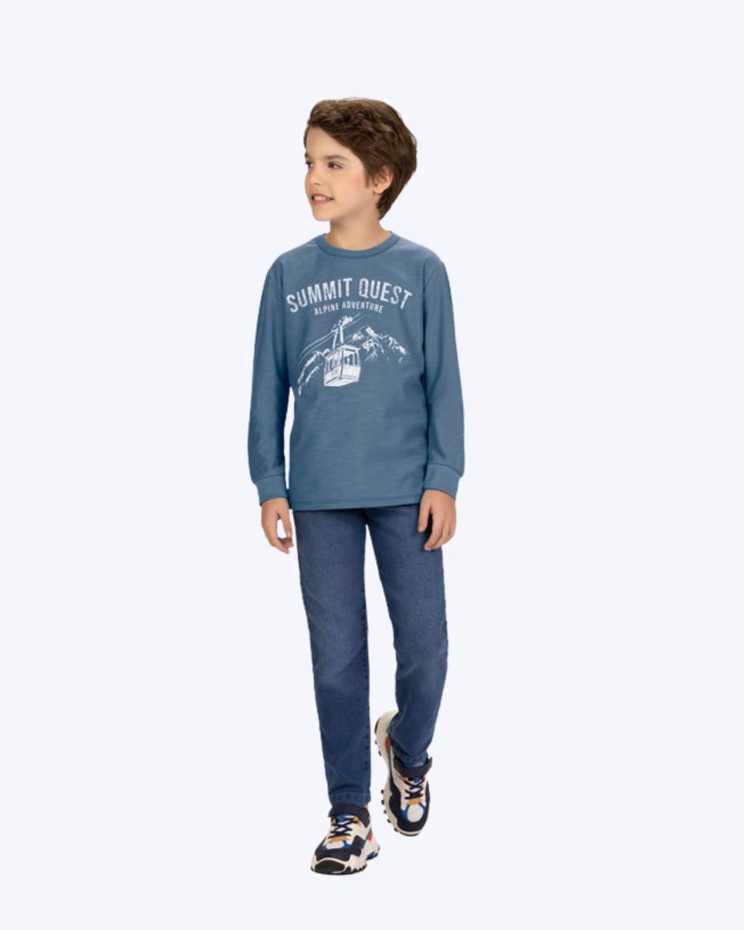 Camiseta manga longa estampada disponível em três cores, modelo infantil para meninos.