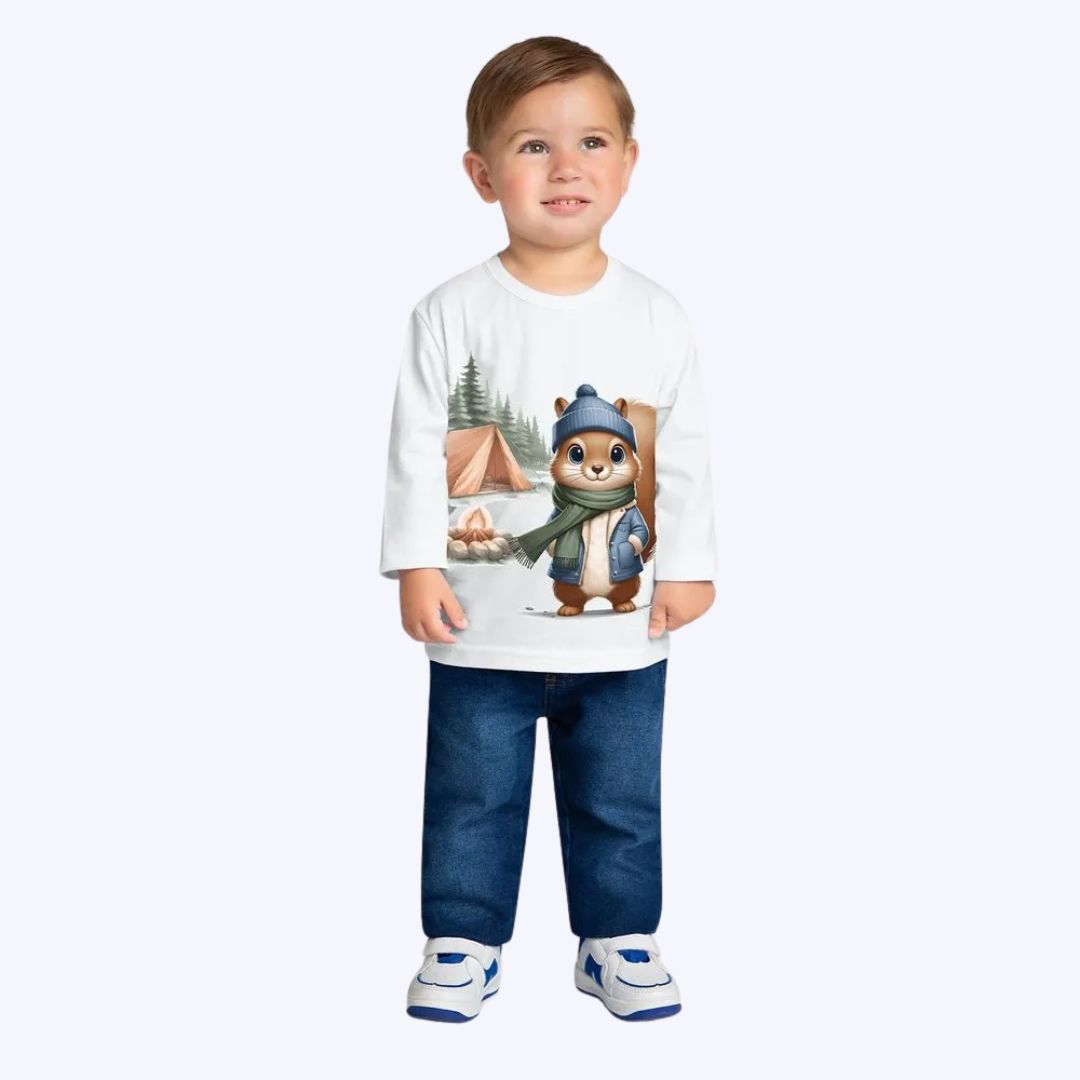 A estampa divertida é o verdadeiro destaque da peça: um esquilo fofo, agasalhado, acampando na floresta, fazendo uma fogueira e pronto para muitas aventuras ao ar livre. Essa cena encantadora desperta a imaginação e traz um toque de magia, perfeito para meninos que adoram explorar e se divertir com o mundo ao seu redor.