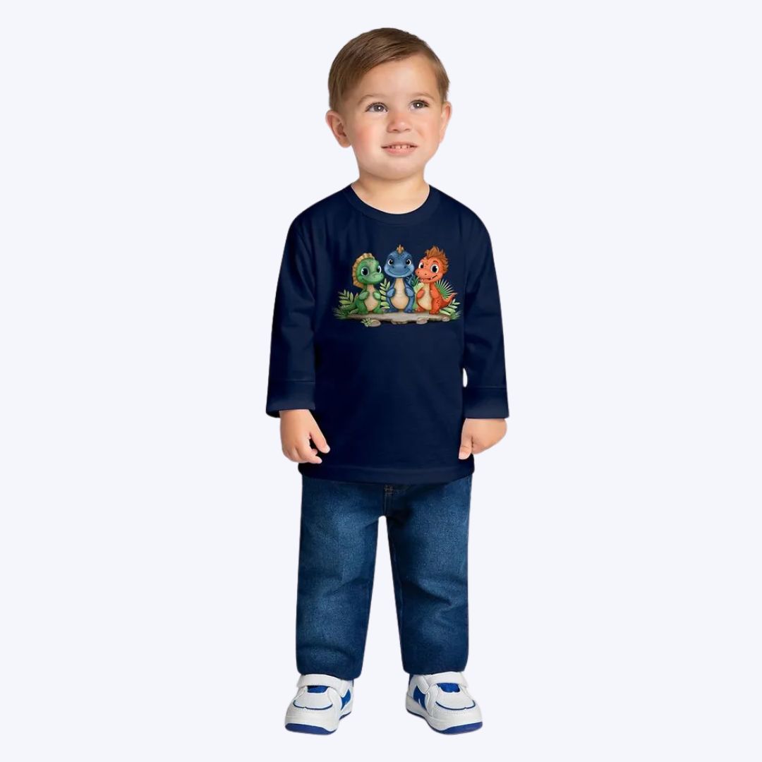 A estampa encantadora, com três fofos dinossauros, traz um toque lúdico e divertido à peça, conquistando os meninos que se encantam com esses incríveis animais pré-históricos. Com cores vibrantes e um design alegre, a estampa adiciona personalidade ao look, tornando o visual ainda mais charmoso e animado.