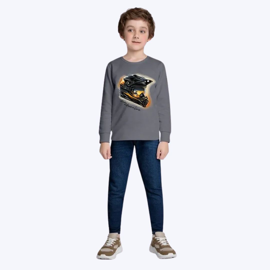 O destaque fica por conta da estampa exclusiva de capacete de motocross, com detalhes vibrantes em laranja, que traduzem toda a adrenalina e ousadia das pistas. Acompanhada de uma frase em lettering moderno, a peça traz uma pegada radical e urbana, perfeita para meninos cheios de atitude.