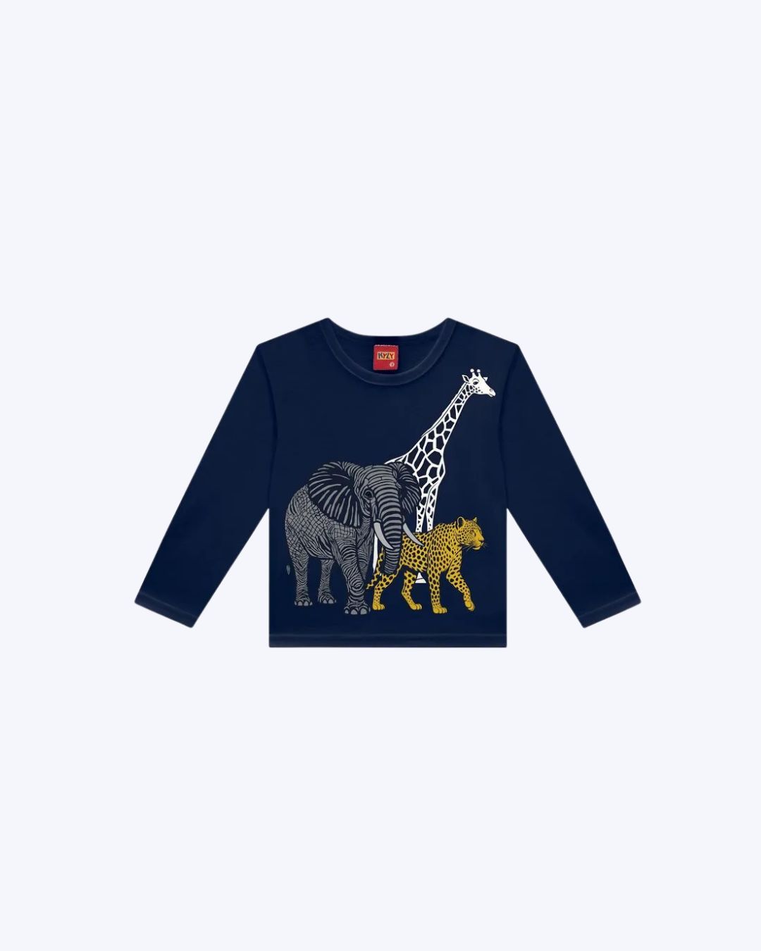 O grande destaque desta camiseta Kyly é a estampa localizada com temática de selva, apresentando ilustrações modernas de girafa, elefante e onça. Os traços gráficos criam um efeito visual sofisticado e cheio de personalidade, valorizando a fauna e adicionando um toque criativo ao visual. Versátil e extremamente confortável, esta camiseta infantil de algodão é a escolha ideal para compor looks casuais e cheios de estilo, refletindo a qualidade e o cuidado nos detalhes característicos da marca Kyly.