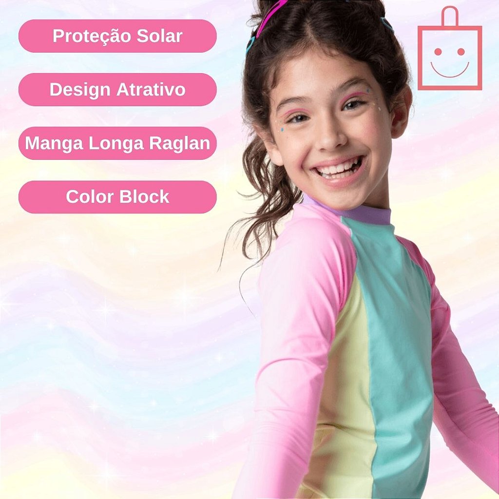 Camiseta para nadar com proteção solar e manga longa raglan, possui lateral sem costura, punhos aplicados e blocos de cor contrastantes, ideal para usar em clubes, academias, piscinas, praia. Seu design chama a atenção, garantindo conforto e estilo para as garotas.