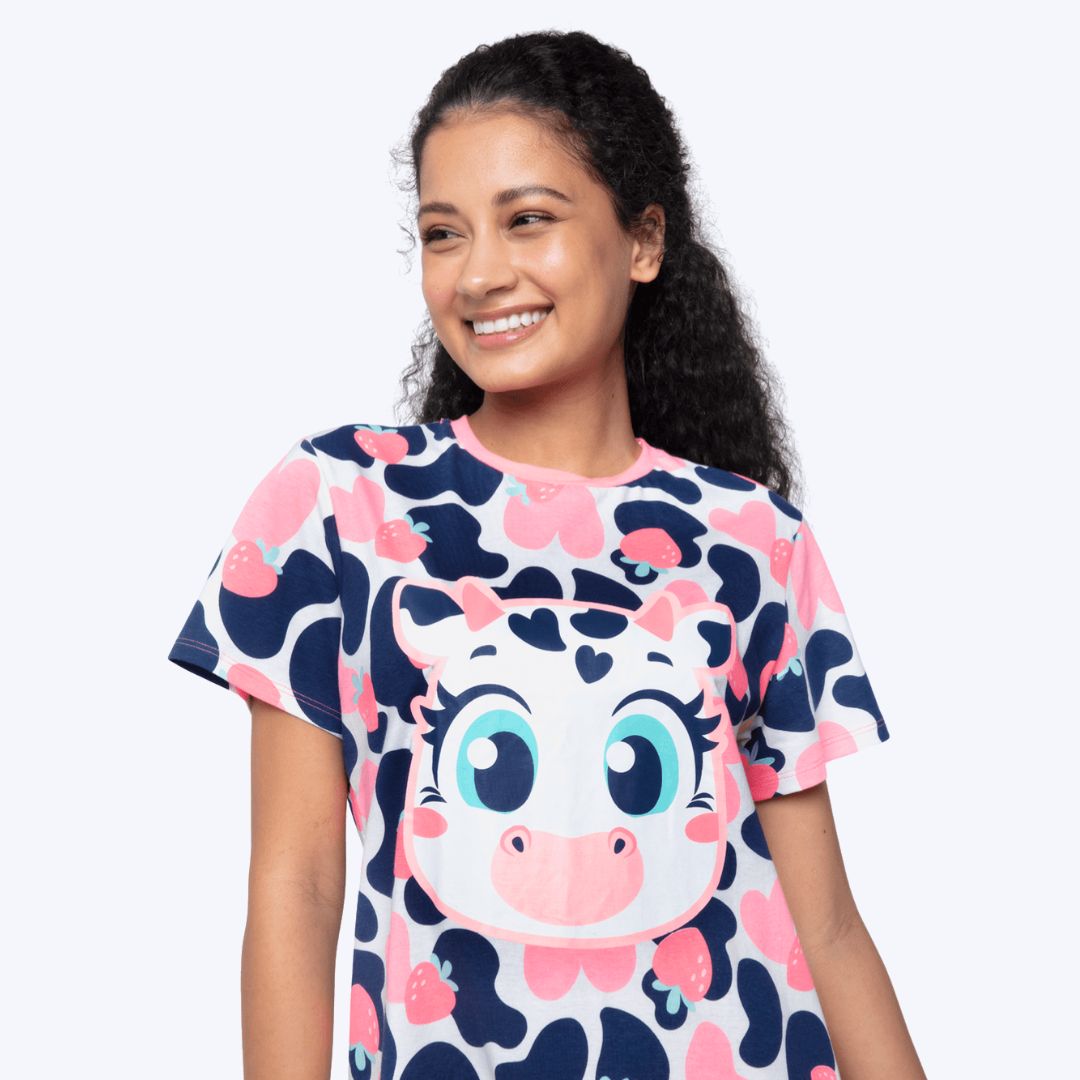 Estampa divertida e exclusiva "Vaca Romântica" com silk localizado na parte frontal, trazendo um toque lúdico e encantador.