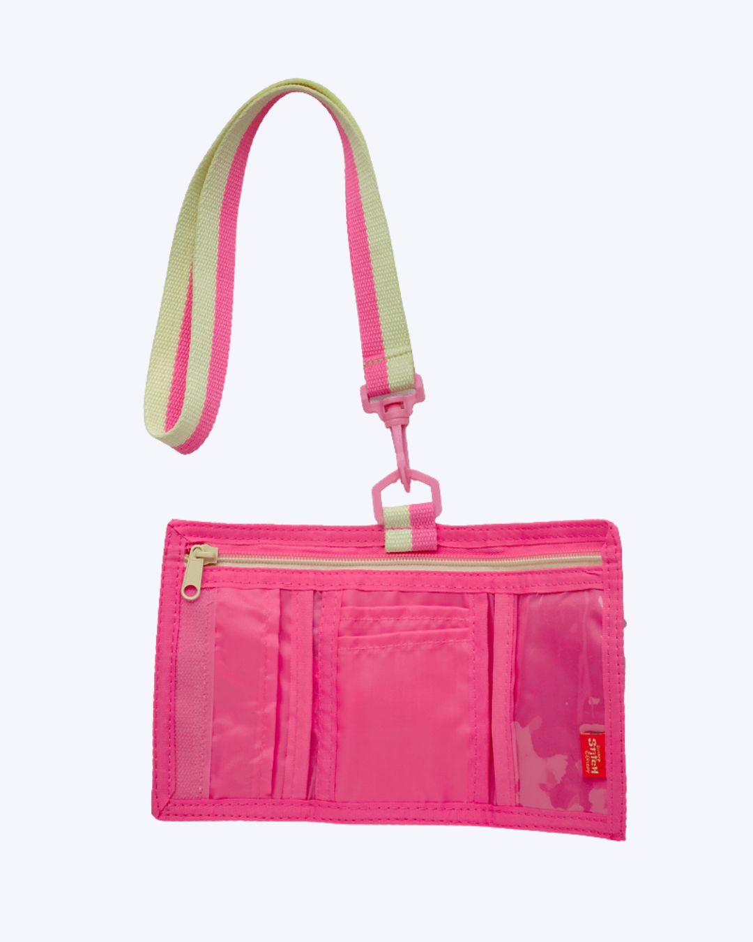 Carteira em nylon com estampa de Stitch e alça de pescoço. Possui aplique emborrachado para fechamento e bolso interno com fechamento em zíper.
