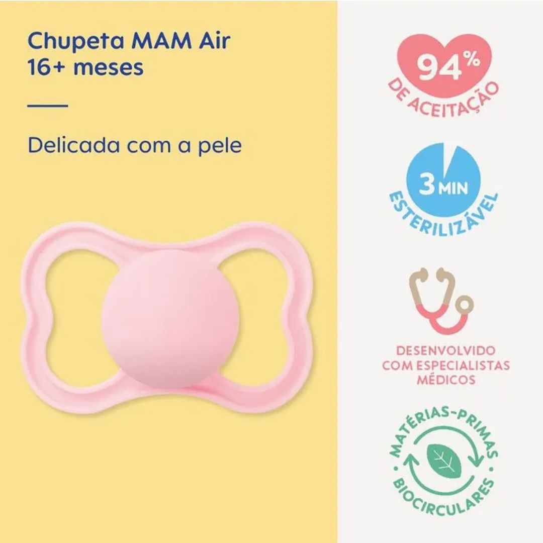 A Chupeta MAM Air foi desenvolvida em parceria com especialistas da saúde. Possui escudo extra ventilado especialmente delicado com a pele. Ideal para sua bebê.