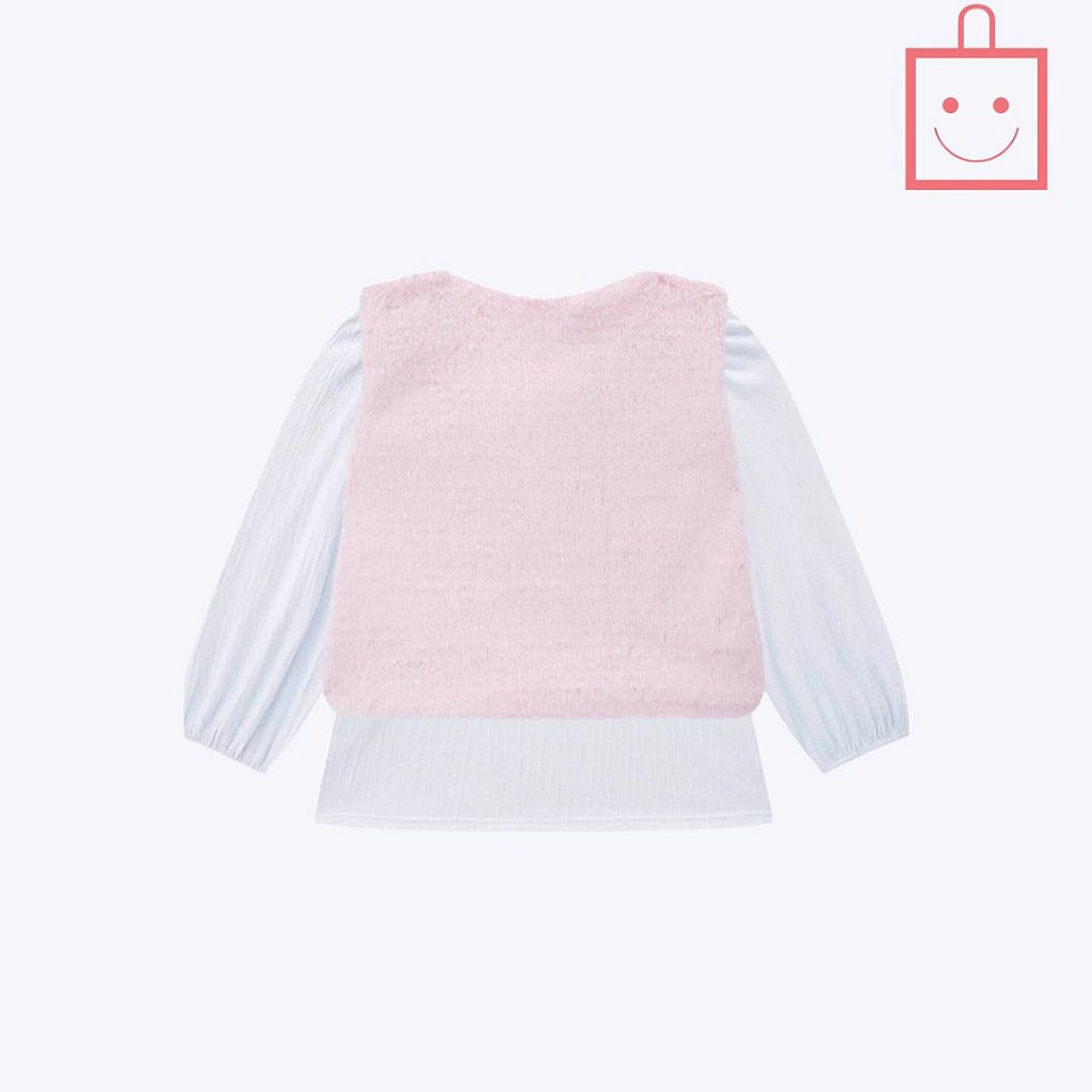 O destaque deste conjunto fica por conta do colete rosa em pelo liso, adornado com detalhes de pedrinhas e um delicado laço. Além de proporcionar um aquecimento adicional nos dias frios, o colete adiciona um toque de sofisticação e elegância ao look, tornando-o ideal para ocasiões especiais.