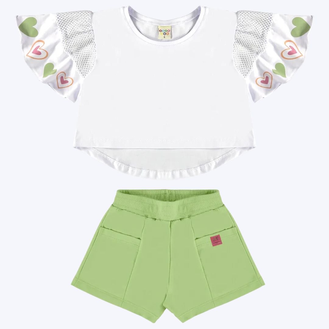 Blusa: A blusa de manga curta é confeccionada em meia malha de alta qualidade, garantindo um toque suave e confortável na pele. O destaque fica por conta das mangas amplas e detalhadas, que trazem um charme especial à peça, além de permitir liberdade de movimento. Com delicados desenhos de corações nas mangas, essa blusa é perfeita para as pequenas que amam um toque de fofura em seus looks. Seu design moderno é ideal para ser usado tanto em passeios quanto em momentos de lazer.