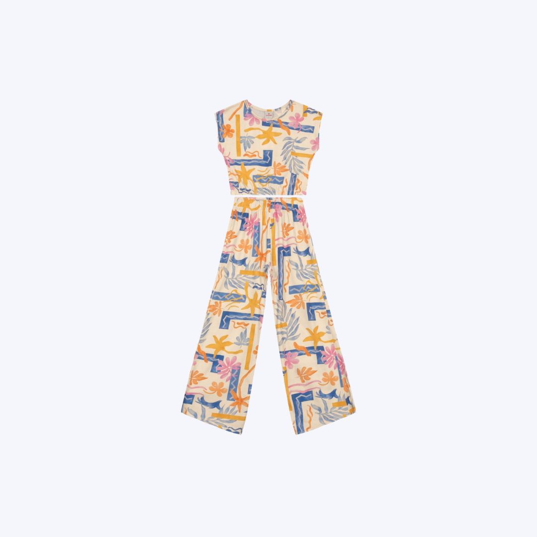 A blusa cropped de manga curta é leve e arejada, perfeita para dias quentes, enquanto a calça pantacourt oferece um caimento elegante e descontraído.