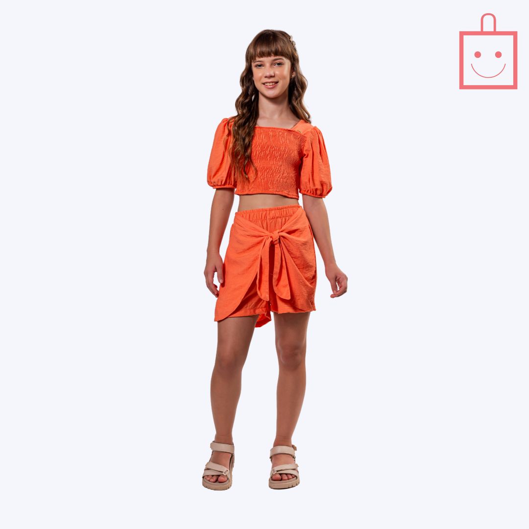 O Conjunto Cropped e Shorts com Amarração Laranja da Vigat é uma peça encantadora e cheia de estilo, perfeita para as meninas que gostam de se destacar.