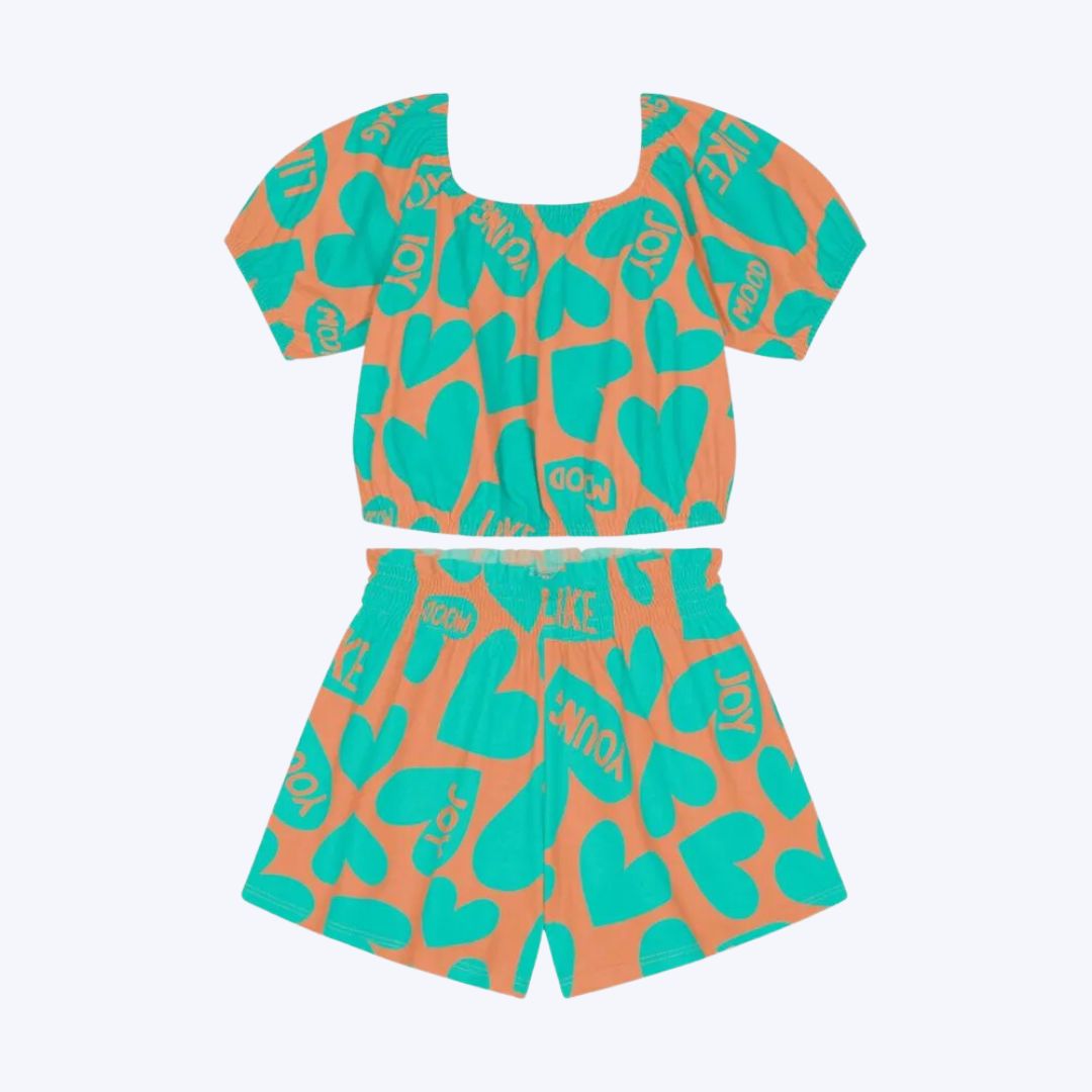 Conjunto Blusa Cropped e Shorts Estampa Corações Infantil Feminino Kyly