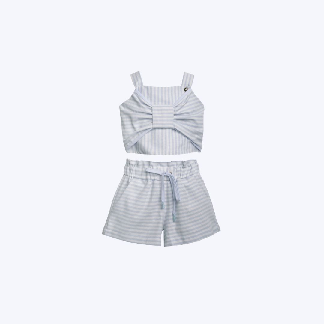 Design moderno e lúdico: A blusa cropped com laço e o shorts clochard listrado criam um visual tendência e divertido para a moda infantil.