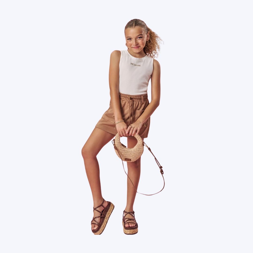 O shorts-saia, com seu design inteligente, combina a praticidade do shorts com a elegância da saia, ideal para brincadeiras e passeios.