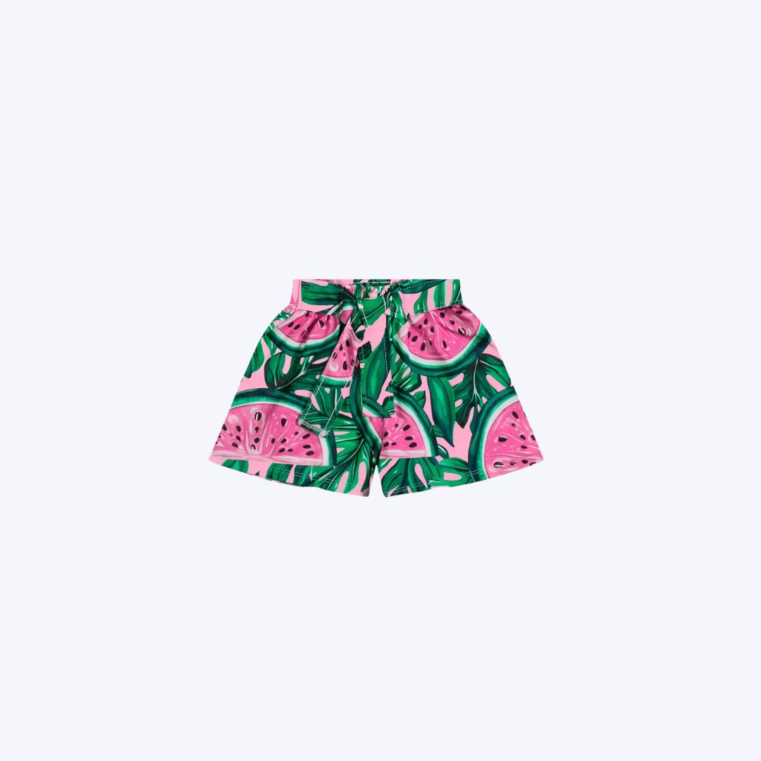 O short, em meia malha 100% algodão, possui modelagem soltinha e confortável, com cintura de elástico rebatido para um ajuste ideal. O grande destaque fica para a estampa rotativa com fatias de melancia e folhas tropicais em cores vibrantes. O toque final está na amarração frontal em fita, que combina funcionalidade e estética com muito estilo. Combinando frescor, delicadeza e diversão, este conjunto é ideal para dias ao ar livre, momentos de lazer ou qualquer ocasião em que as pequenas queiram estar lindas e livres para brincar.