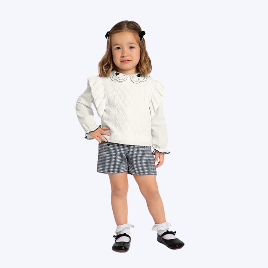Conjunto Blusa de Manga Longa com Colete de Tricot e Shorts Tweed Infantil Menina Milon