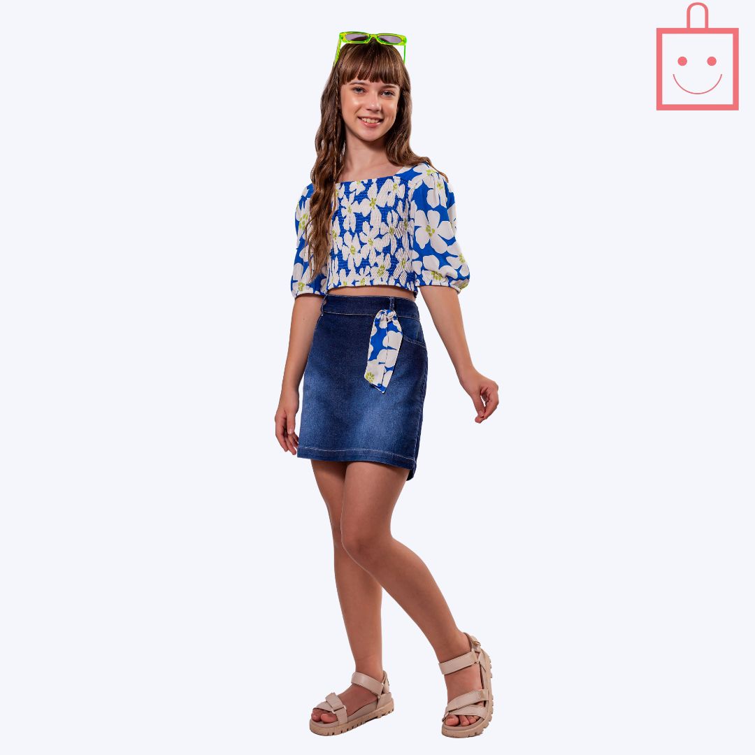 Perfeito para as meninas que gostam de estar na moda de forma prática e cheia de estilo, o Conjunto Blusa Estampa Floral e Saia Jeans Juvenil é a opção ideal para compor looks incríveis, confortáveis e com aquele toque especial que toda peça da Vigat oferece.