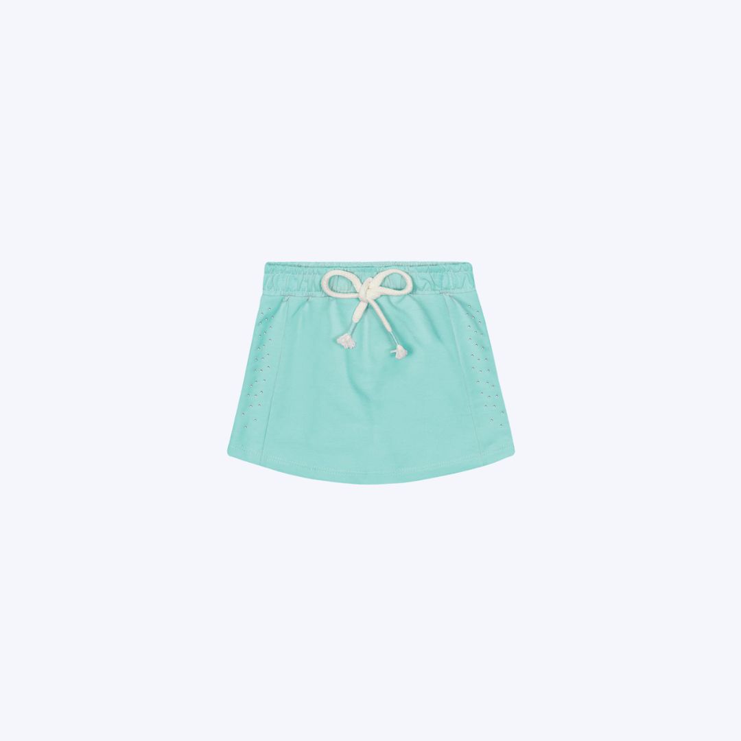 Praticidade do shorts-saia embutido com ajuste no cós, oferecendo conforto e segurança para brincar.