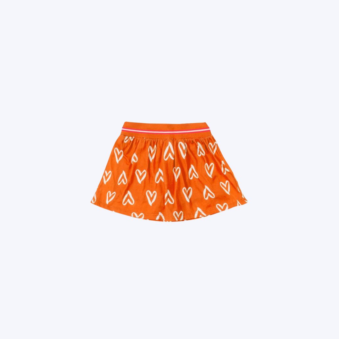 A saia com estampa rotativa de corações e cós elástico garante um ajuste perfeito e liberdade de movimentos para as brincadeiras.