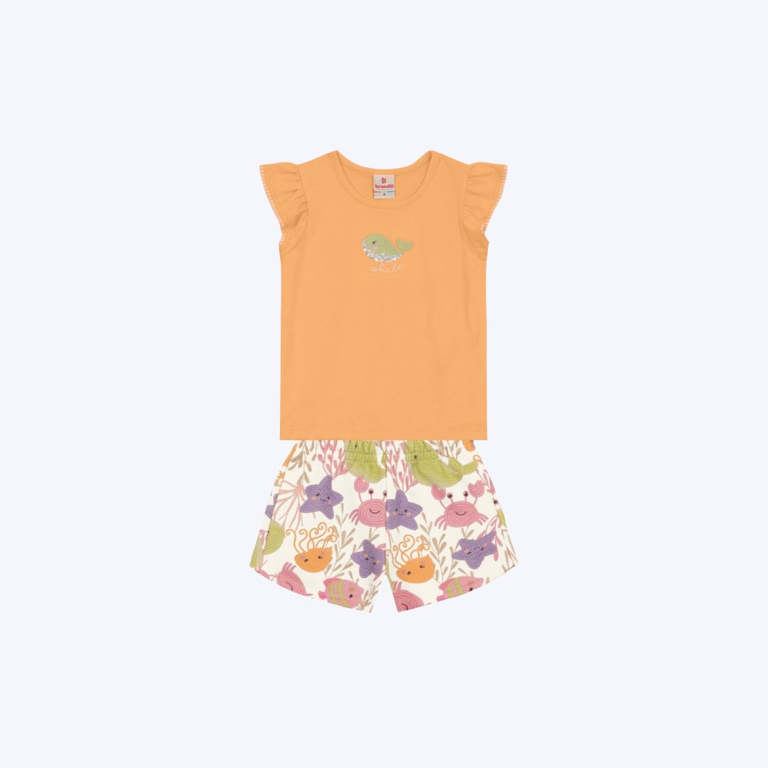 Design exclusivo Brandili com estampa bordada de animal marinho na blusa e estampa rotativa no shorts, destacando-se pela originalidade.