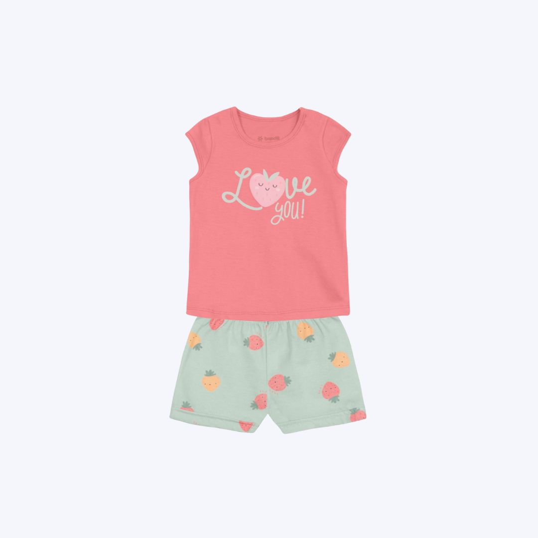 Design exclusivo com blusa 'Love you' e shorts de florzinha, garantindo um visual encantador e moderno.