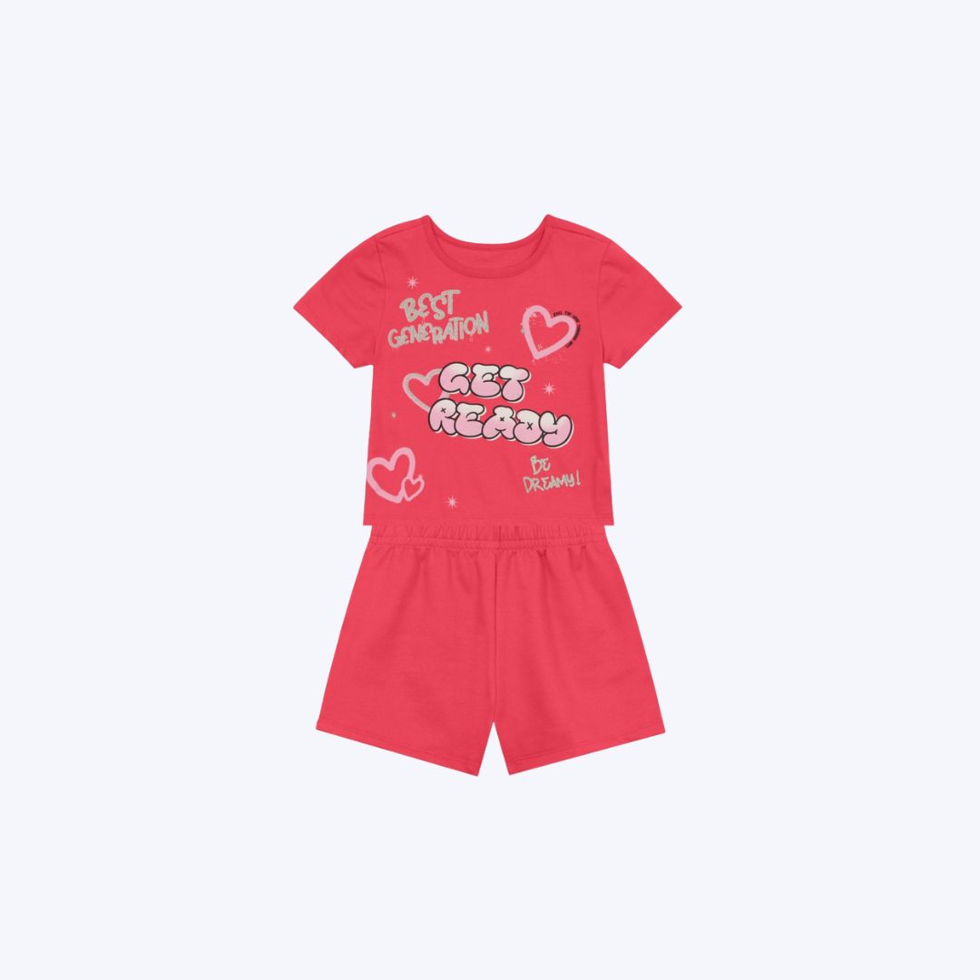 Design moderno e versátil: Com blusa estampada e shorts de malha, o conjunto é perfeito para diversas ocasiões, disponível em duas cores vibrantes (Goiaba e Rosa) para mais opções de estilo.