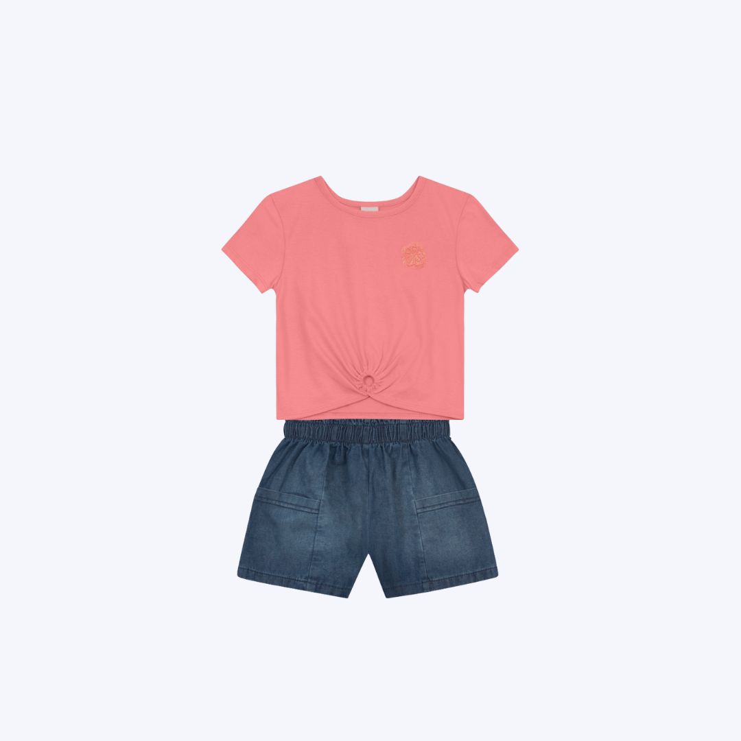 A vibrante cor salmão da blusa, complementada pelo shorts, cria um visual alegre e fácil de combinar, tornando este conjunto uma peça-chave no guarda-roupa de verão da sua filha.