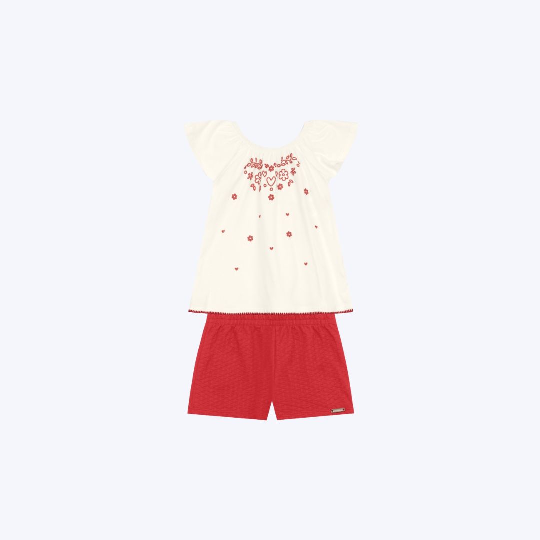 A combinação de blusa e shorts forma um look completo e prático, facilitando o dia a dia dos pais.
