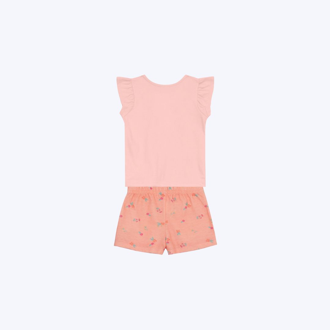 Detalhes do Design: Blusa manga curta com bordado de pequenas florzinhas e Shorts-saia de babadinho com estampa rotativa de florzinhas