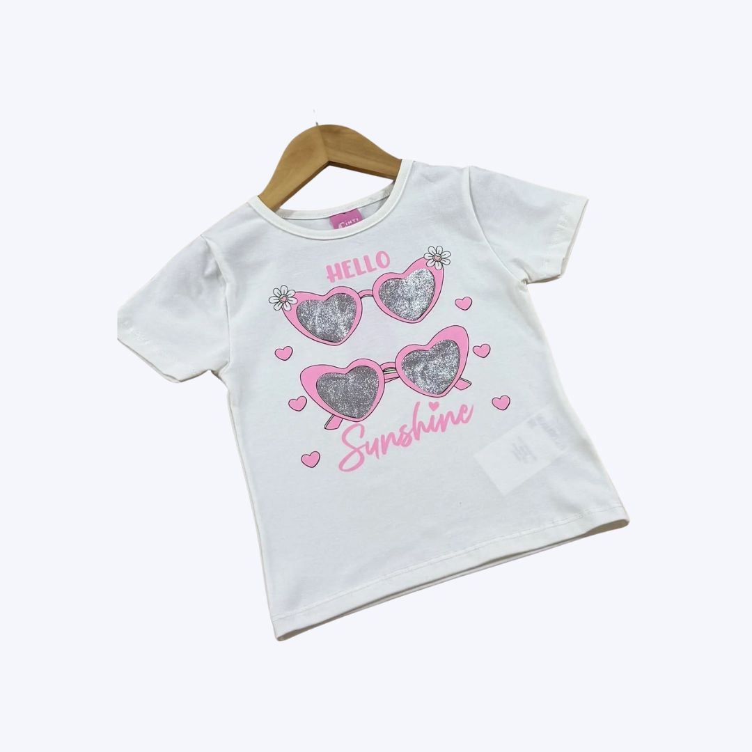Design moderno e divertido com estampa "Hello Sunshine" e shorts rosa, perfeito para o universo infantil.