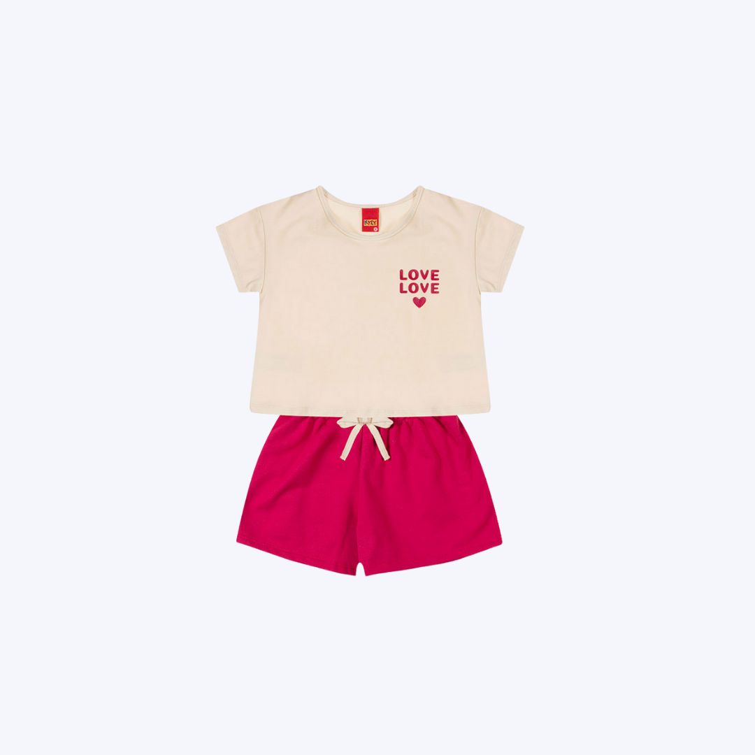 Conjunto Blusa Manga Curta Love e Shorts Liso Infantil Menina