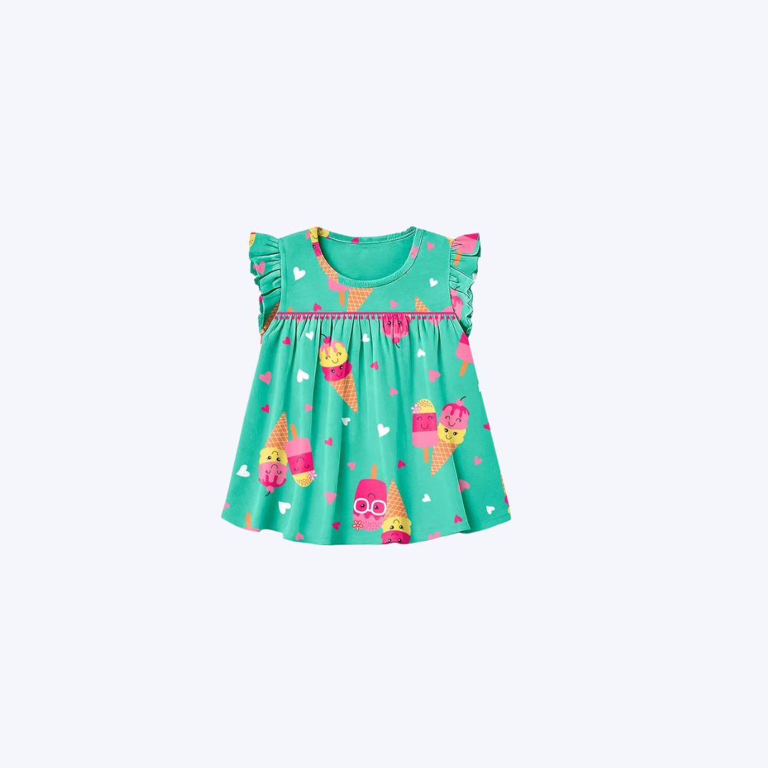 Design Divertido e Charmoso: A estampa exclusiva de picolés, sorvetes e corações com detalhes em glitter strass, aliada às manguinhas com volume e aviamento, cria um visual encantador e lúdico.