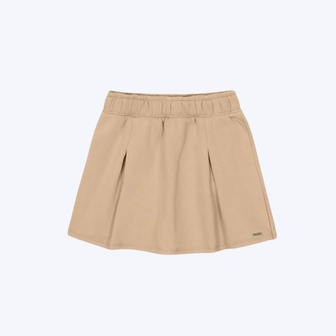 Shorts-Saia: O shorts-saia, feito em moletom felpado 100% algodão, é um item superconfortável, com elástico no cós para um ajuste perfeito. As pregas frontais trazem um detalhe de sofisticação, enquanto a plaquinha decorativa próxima da bainha adiciona um toque especial e moderno ao look. Um visual prático e estiloso para os dias de diversão!