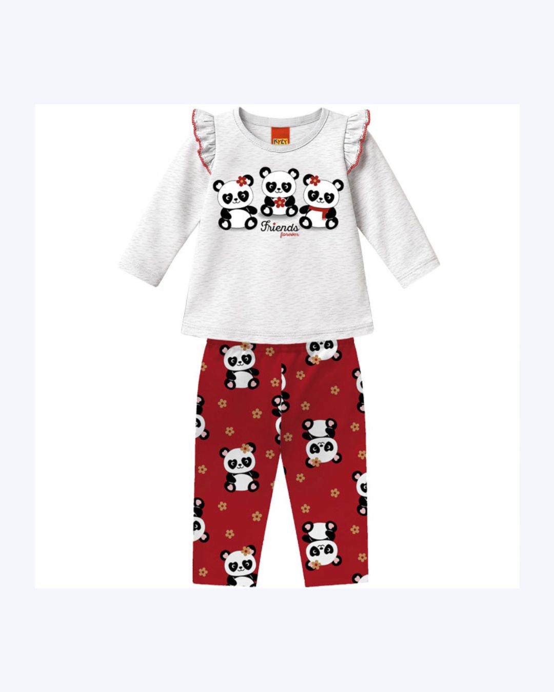Encantador e cheio de alegria, este conjunto infantil menina da Kyly traz um visual delicado e divertido que celebra o universo lúdico da infância. Com cores vibrantes e personagens adoráveis, o look combina conforto e charme para acompanhar as pequenas em momentos de brincadeira, passeios ou produções casuais cheias de personalidade. A blusa é confeccionada em meia malha 100% algodão, um tecido leve, macio e respirável que garante conforto durante todo o uso. A modelagem apresenta caimento suave ao corpo, permitindo liberdade de movimentos para a rotina infantil. O destaque da peça está na estampa localizada com adoráveis pandinhas, que trazem um toque divertido e carismático ao visual. As mangas contam com delicado acabamento em picueta e pequenos babados nos ombros, adicionando movimento e um charme especial à peça.
