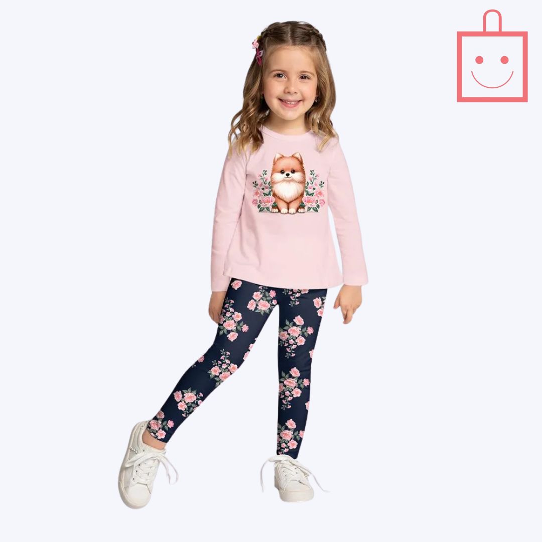 Encante-se com o charme e o conforto deste lindo Conjunto Blusa Manga Longa e Calça Legging Infantil Menina Kyly! A blusa, confeccionada em meia malha 100% algodão, apresenta uma estampa localizada de um adorável cachorrinho rodeado por flores, criando um visual doce, romântico e super delicado.