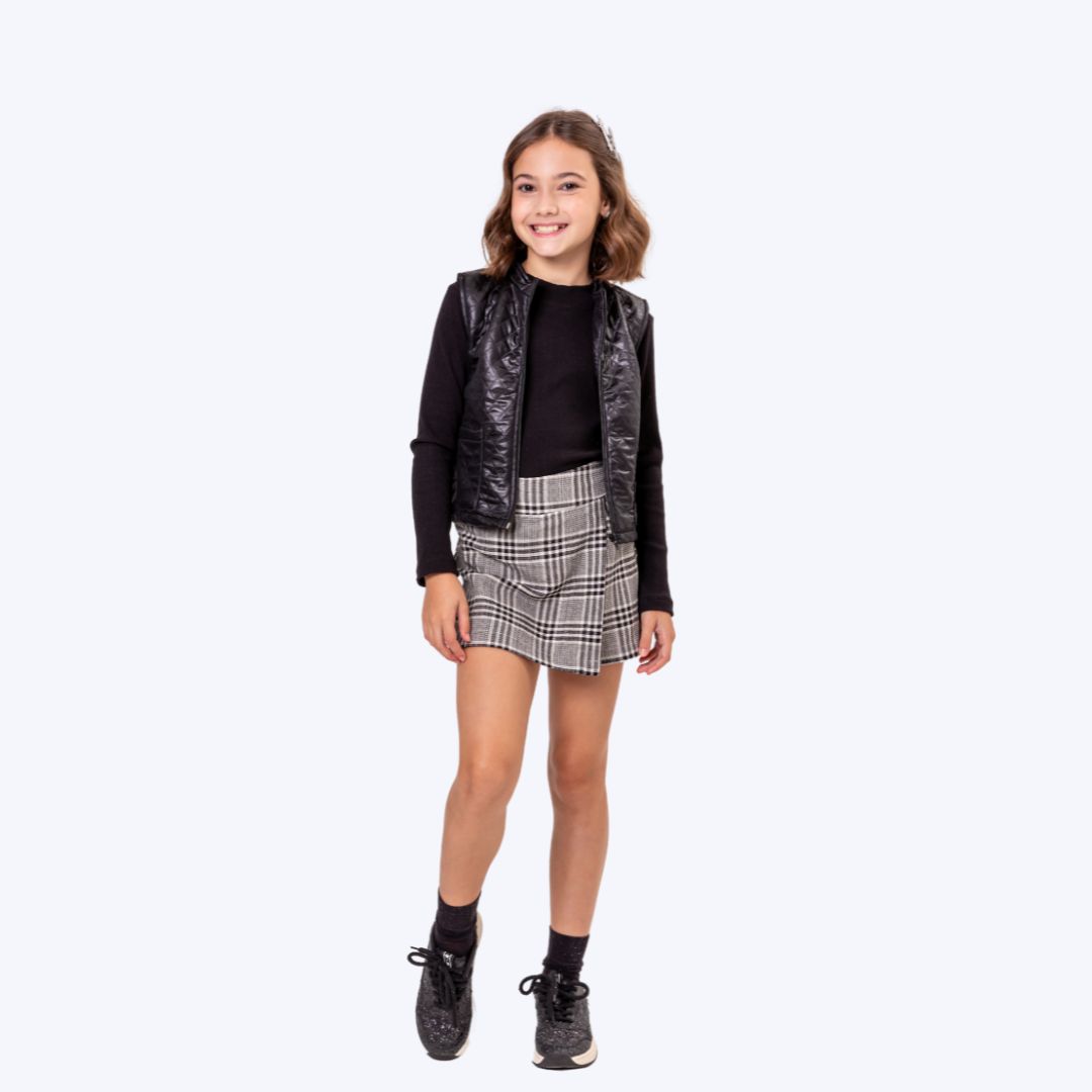 Componentes: Blusa manga longa preta, Short-saia envelope xadrez, Colete preto