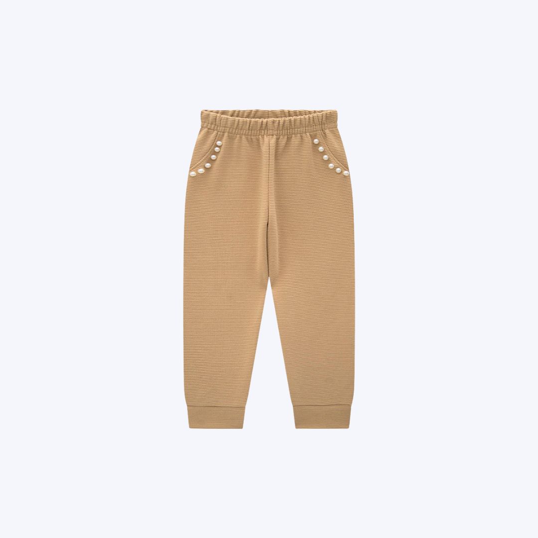 A calça, confeccionada em algodão com elastano (96% algodão, 4% elastano), possui punhos na barra para melhor ajuste ao corpo e conforto ao vestir. Os bolsos decorados com pequenas pedrinhas brilhosas adicionam um detalhe delicado e encantador, completando o visual com um toque de glamour infantil.