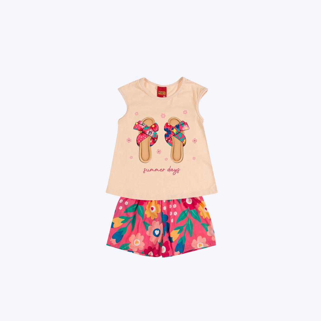 Design exclusivo com estampa de chinelinhos e flores na blusa e estampa floral vibrante no shorts, oferecendo um visual lúdico e moderno.